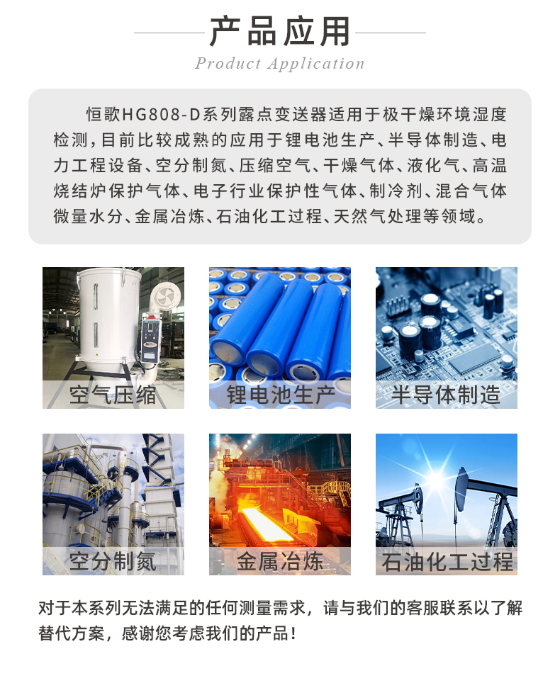 HG808-D系列在線露點變送器結合了高品質濕敏元件和先進校準技術非常適用于極干燥環境的露點測量,露點范圍涵蓋-60~90°℃,并且實現±2℃ Td高精誤差。也正因變送器在干燥環境下對微水靈敏的感知能力,常被用于需要對環境濕度進行精確控制的場合,,例如鋰電池研究生產、半導體應用、壓縮空氣干燥設備出氣口、手套箱微水檢測等場景。